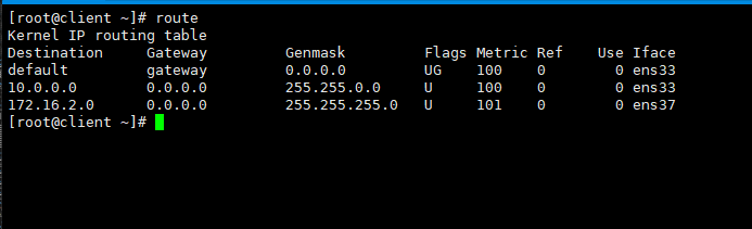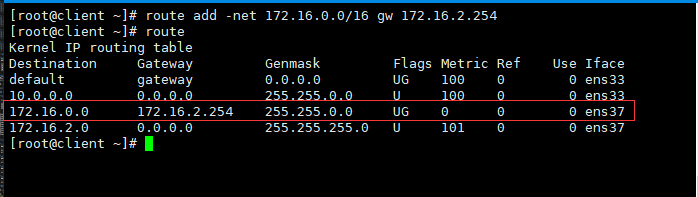 因?yàn)?code>client位于172.16.2.0/24網(wǎng)絡(luò)內(nèi),在網(wǎng)絡(luò)內(nèi)進(jìn)行通信,數(shù)據(jù)包不用發(fā)送至其他網(wǎng)絡(luò),當(dāng)然默認(rèn)網(wǎng)關(guān)也就不起作用了。