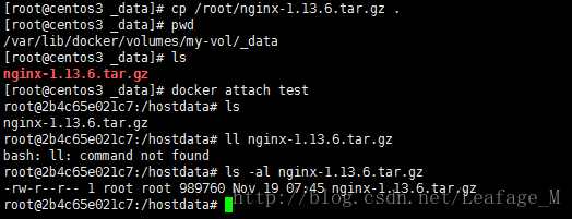 我將nginx這個文件復制到主機中用來交換的目錄下,進入容器之后在hostdata的目錄下也可以查看: