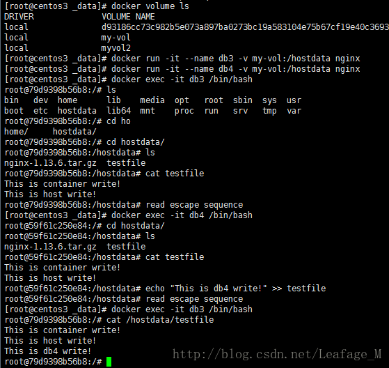 可以看到通過-v命令將剛才創建的數據卷掛載到容器中的hostdata目錄下了,這時候我們在容器中給hostdata目錄下添加文件的時候,在主機的的/var/lib/docker/volumes/my-vol/_data中就可以看到了,同理在主機的該目錄中添加文件,在容器的hostdata中也可以看到。