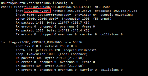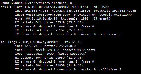 現在再次驗證所有可用的網絡接口,ens33以太網接口現在應連接到本地網絡,并具有IP地址,如以下截圖所示。