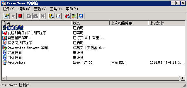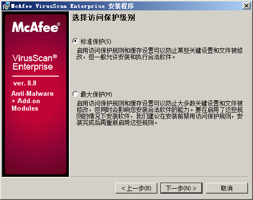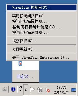 殺毒軟件與防火墻的安裝,最好將 ”6.14.配置McAfee防火墻” 之前的所有步驟全部完成后才進行,不然可能會造成一些配置或操作無法成功的情況,因為防火墻安裝成功后,會阻止系統軟件的運行與操作。如果已經安裝好了的話,則先打開殺毒軟件控制臺,將“訪問保護”先禁用,而防火墻則先不開啟。