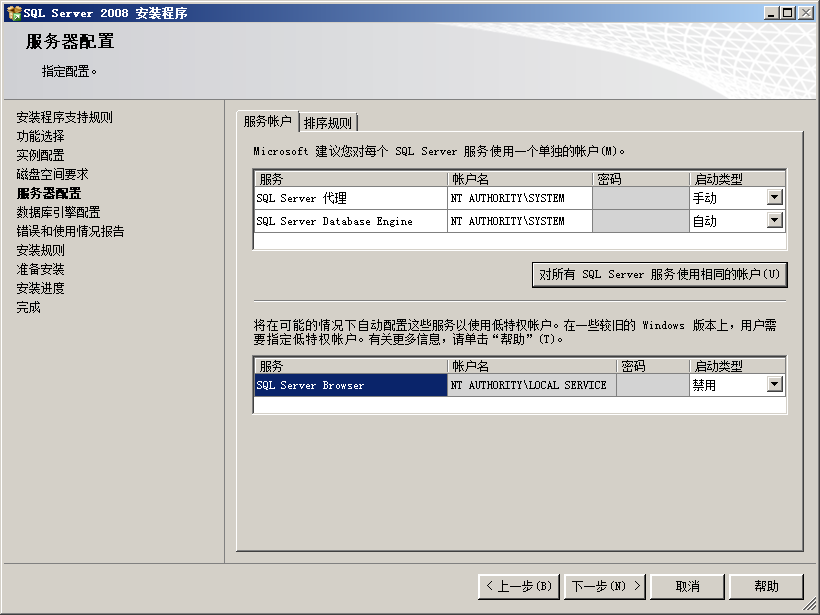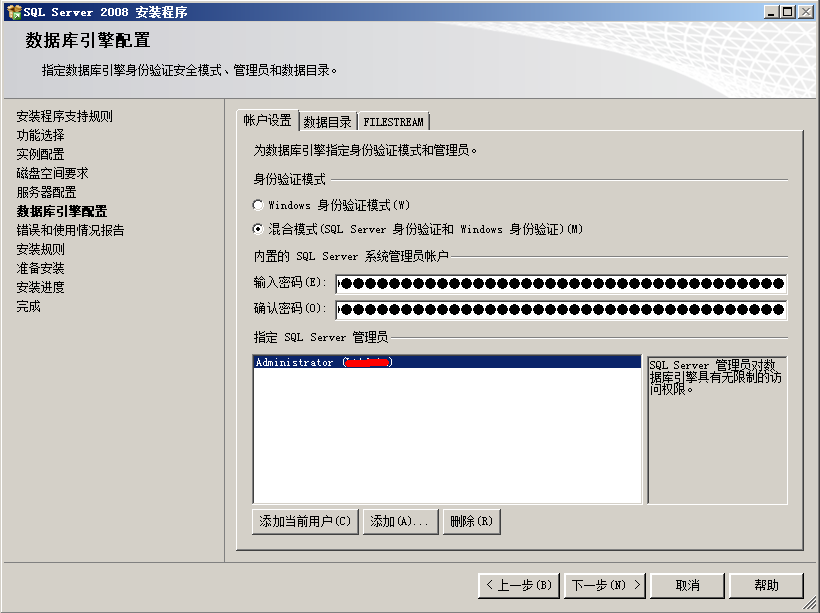 繼續安裝SQL2008,請先操作第6.1修改系統默認帳戶名步驟后的管理員用戶再進行下面步驟