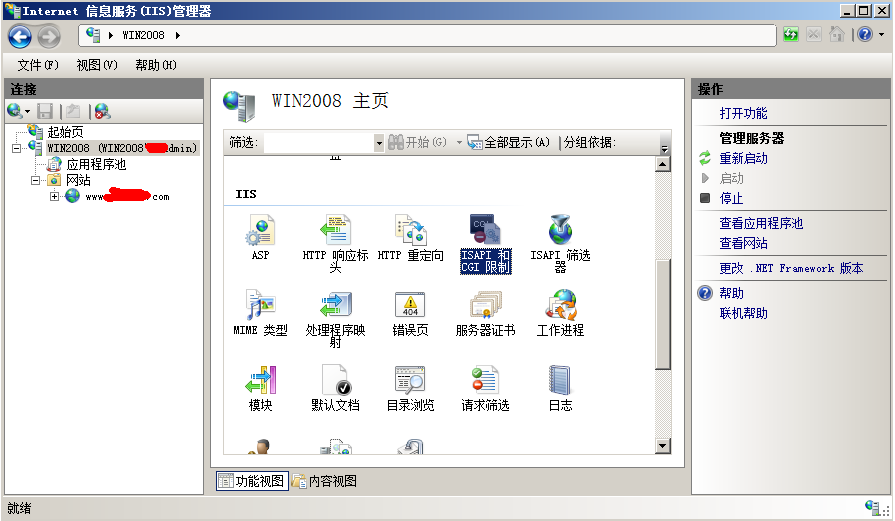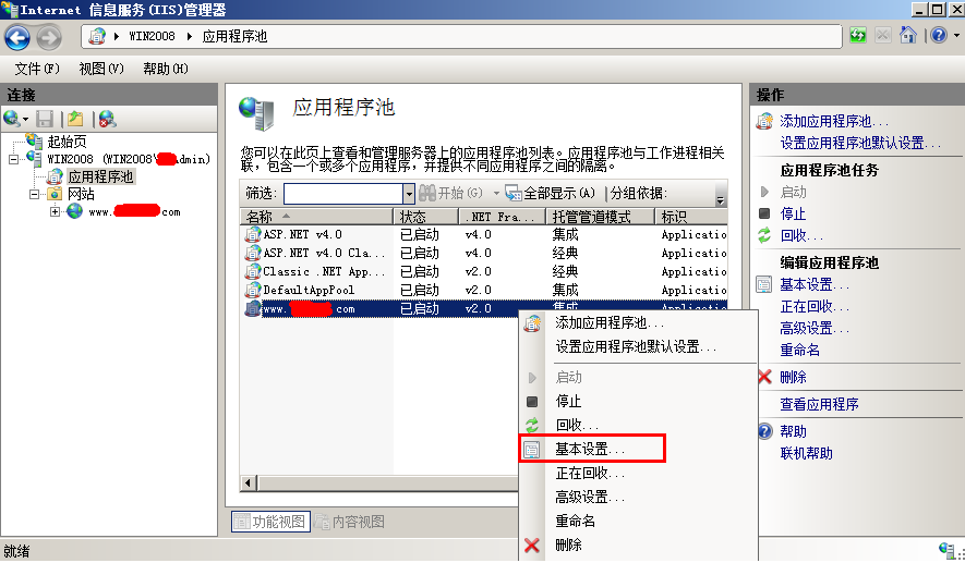 點擊應用程序池,將剛創建好的網站對應程序池.NET Framework版本和托管管道模式