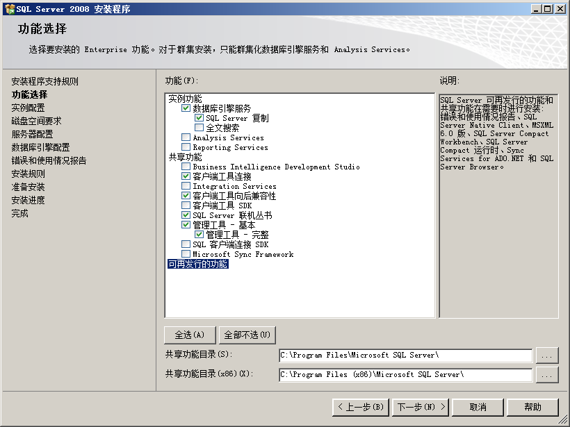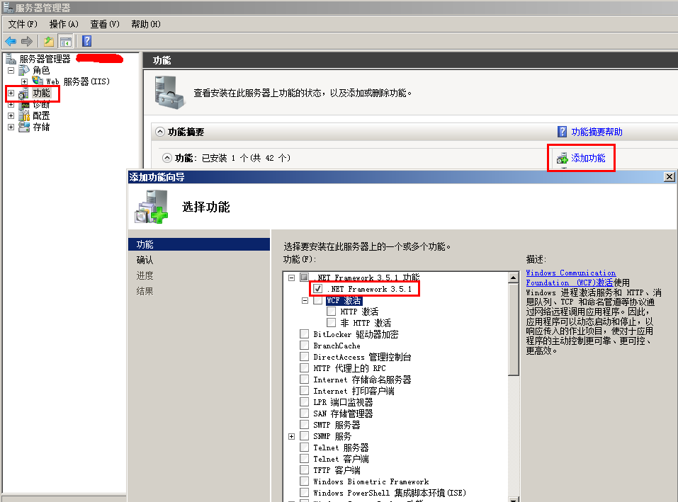 安裝SQL2008前,首先要安裝.net3.5框架,打開服務器管理器,點擊功能=》添加功能=》勾選.NET Framework3.5.1運行安裝