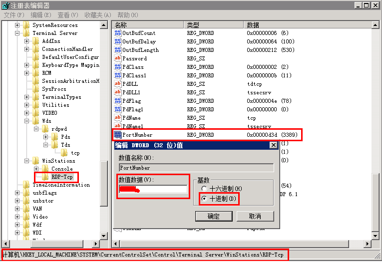 將HKEY_LOCAL_MACHINE\SYSTEM\CurrentControlSet\Control\Terminal Server\WinStations\RDP-Tcp項的PortNumber值由3389修改為12345
