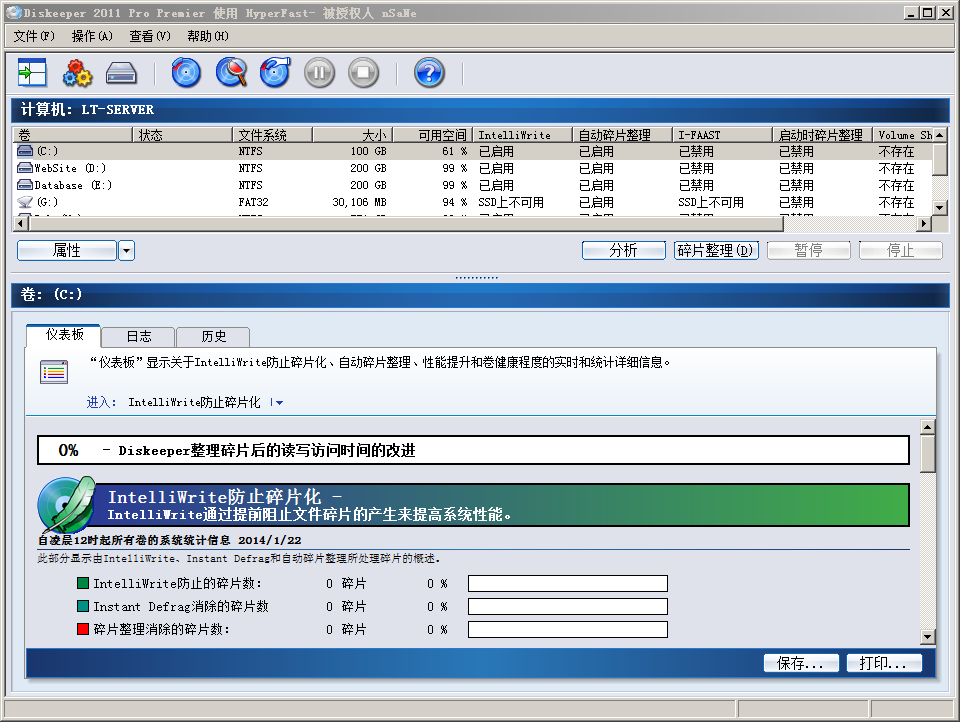 Diskeeper2011_ProPremier是一個實時碎片整理程序,它不干擾系統資源,自動化運行,可以自動防止關鍵系統文件產生碎片,實時監控磁盤,一旦產生碎片就進行整理,最大程度地保證系統穩定性和速度,而它的智能文件訪問加速順序技術I-FAAST2.0最高可將最常用文件的訪問速度提高80%(平均10%~20%)。(具體介紹請查看官方相關文檔)