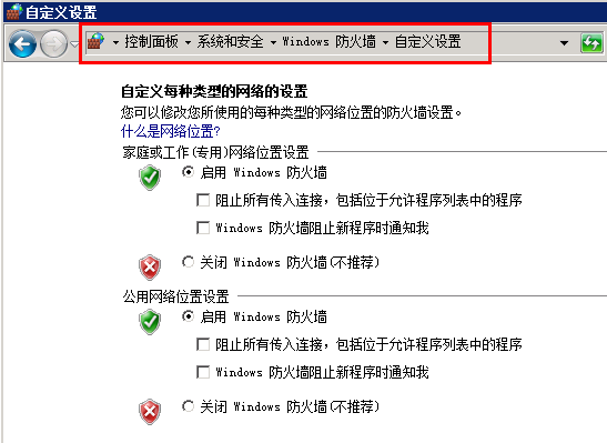 開啟系統防火墻(控制面板=》系統和安全=》Windwos防火墻=》打開或關閉Windows防火墻),如果遠程操作的話就要小心,不要將自己的連接也給禁用了
