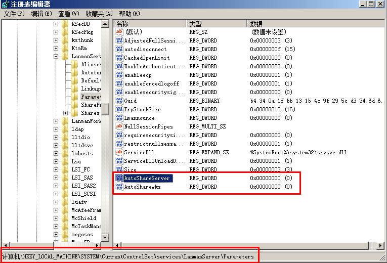 新建DOWRD值,名稱為“AutoShareServer”、“AutoShareWKs”,設置值為“0”