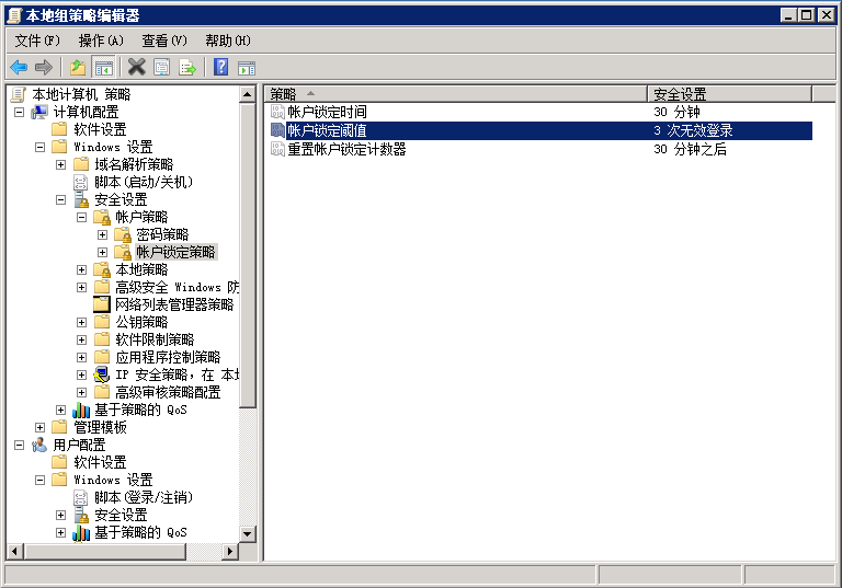 在運行中輸入gpedit.msc回車,打開組策略編輯器,選擇計算機配置-Windows設置-安全設置-賬戶策略-賬戶鎖定策略,將賬戶設為“三次登陸無效”,“鎖定時間30分鐘”,“復位鎖定計數設為30分鐘”。