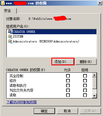 然后為當前創建的網站設置相應的文件夾訪問權限
