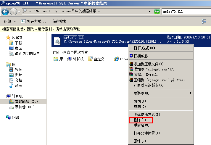 進入安裝好的SQL目錄搜索 xplog70.dll 然后將找到的文件刪除(這樣操作會使SQL代理服務停止運行,所以如果使用代理功能的朋友請不要刪除)