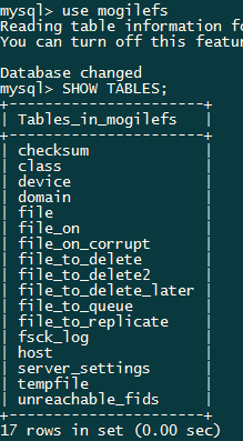 初始化完成后可以在MySQL中看到創建好的mogilefs庫以及里面的表: