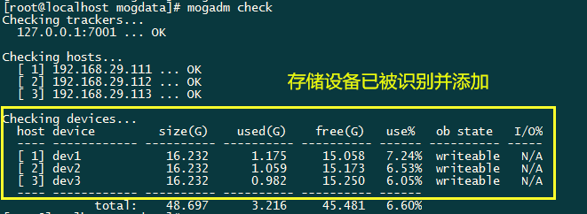 在n1、n2、n3上的/mogliefs/mogdata/目錄下分別創建dev1,dev2,dev3目錄,并在Trackers上添加設備: