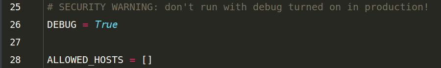 代碼肯定有bug,如果DEBUG = True,就會直接把異常傳給網頁前端,一般在寫代碼時打開,方便找錯,但在實際生產中肯定要關掉,不能給用戶看到這個。ALLOWED_HOSTS = [ ]:如果在里面添加東西:如ALLOWED_HOSTS = [ localhost ],Django則只允許通過localhost訪問頁面,其他的都被屏蔽了,127.0.0.1也就不行了。