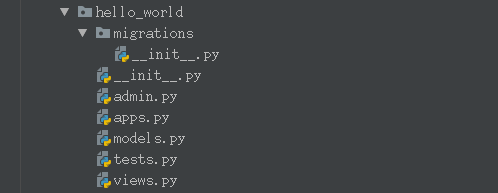 切換到和manage.py的同級目錄中,命令行輸入python3 manage.py startapp hello_world 或 python3 manage.py startapp hello_world,就創建好了一個名為hello_world的應用。文件結構為: