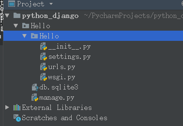 輸入命令:django-admin.py startproject Hello;(即創建好了一個名為Hello的項目)