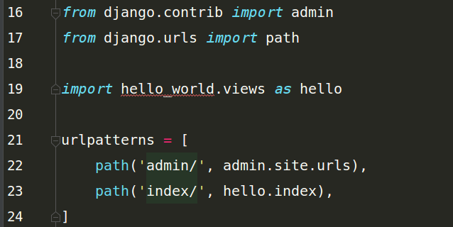 urlpatterns = [ ]是一個列表,里面裝著這個項目中所有網頁的路徑,index/時我們剛剛寫的hello,world的網頁地址,hello.index時hello下的一個函數,但是我們時導入了hello_world應用下的views.py文件當作hello來用,所以hello.index也就是hello_world應用下的views.py文件下的一個函數。