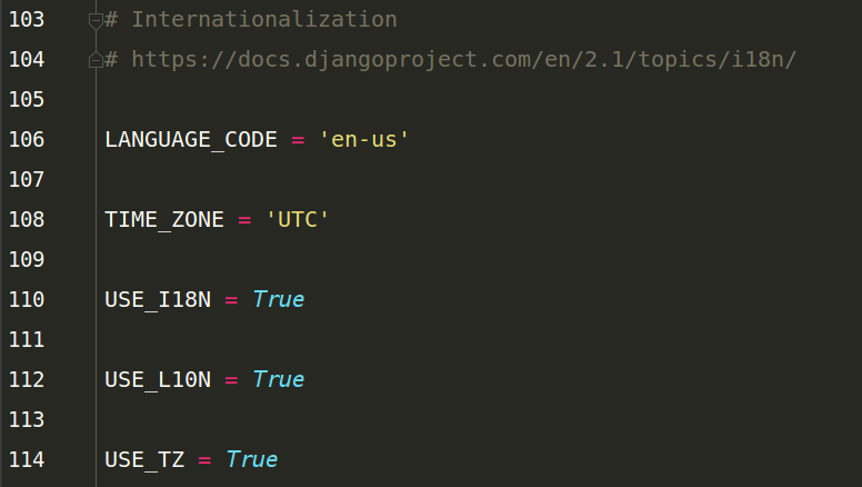國際化,就是時間,語言之類的東西,LANGUAGE_DODE = ‘en-us',默認為英語,TIME_ZONE = 'UTC'默認時UTC 時區。