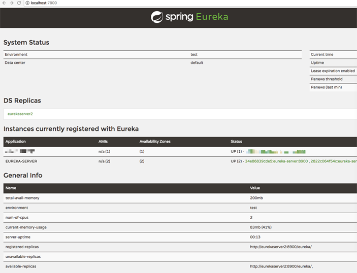 通過上圖可知,在registered-replicas和available-replicas兩項(xiàng)均能看見另外一個(gè)eureka服務(wù),至此eureka 集群搭建完成。