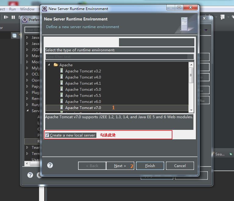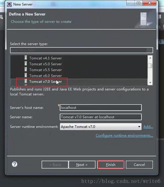 8、在新增Server 實例對話框中選擇正確的Server版本,點擊“Finnish” 完成 Server 實例創建,此時可以在Server面板可以看到一個tomcat Server實例