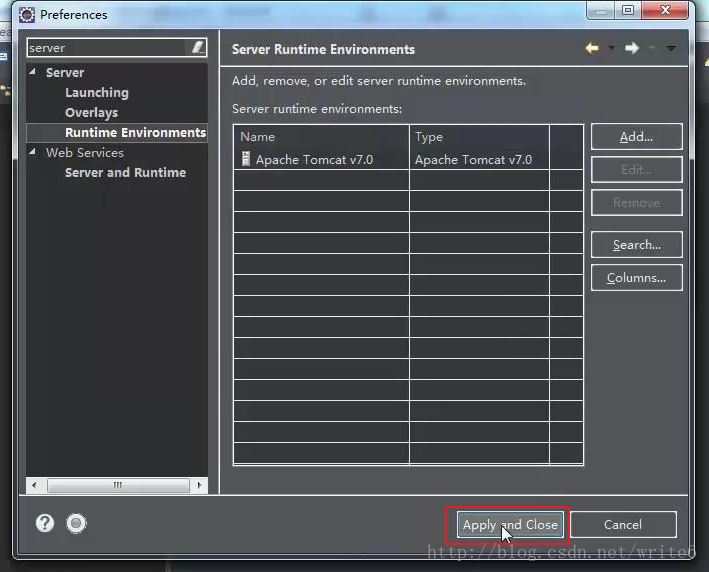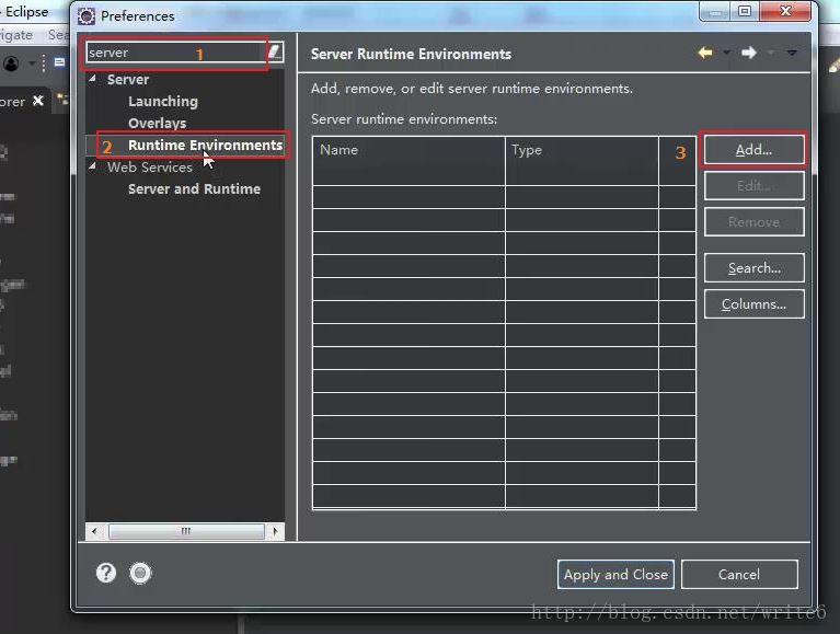2、在“首選項”窗口輸入 “server”搜索定位到 “Runtime Environments”,點擊 “add”