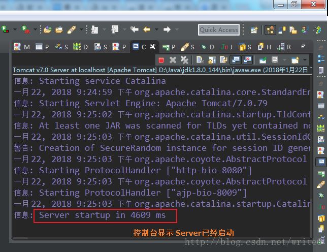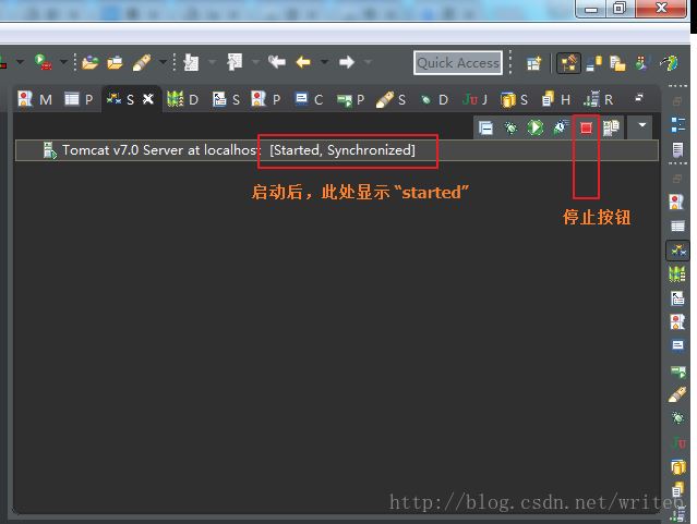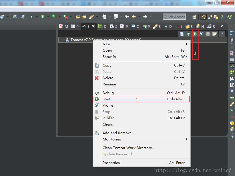 10、在下圖 1 或 2 處可以啟動tomcat server ,點擊 “start”