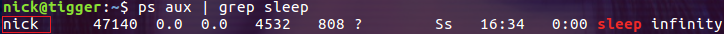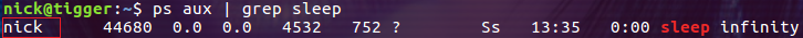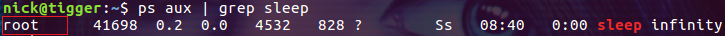 因為我們在命令行上指令了參數 --user 1000,所以這里 sleep 進程的有效用戶顯示為 nick。進入到容器內部看一下: