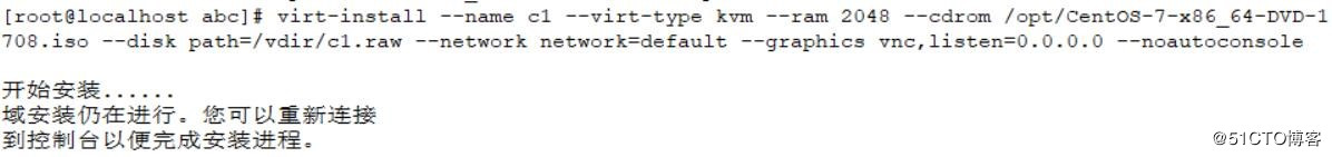 2、使用virt-install創建名稱為c1(自定義)的虛擬機,此前需將centos7的鏡像放置虛擬機中。