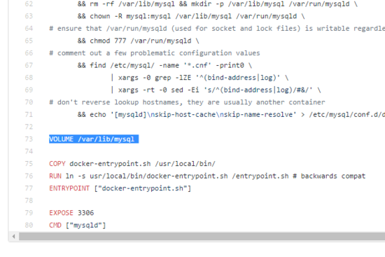 以官方鏡像mysql的dockerfile文件為例 。其中dockerfile通過volume指定了當(dāng)前容器中要備份的文件路徑,但是并沒有指定說要保存到宿主機(jī)的哪個位置。