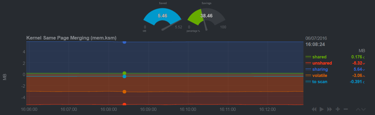 您可以通過在Netdata儀表板中查找新添加的活動(dòng)KSM圖表來驗(yàn)證KSM現(xiàn)在是否已啟用。這可以在右側(cè)菜單樹中的Memory > Memory Deduper下找到。