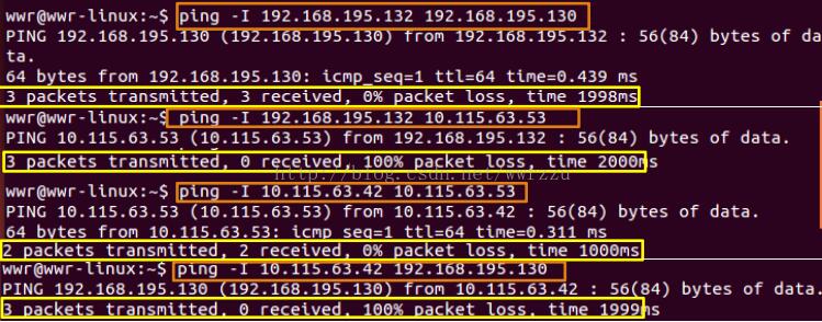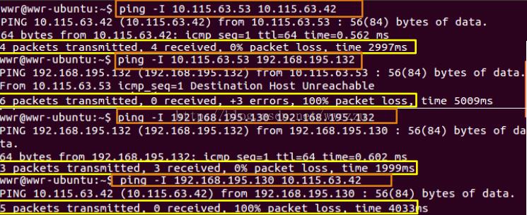 如果不使用I參數(shù),直接在虛擬機(jī)上ping 192.168.195.132和ping 10.115.63.42 或在虛擬機(jī)2上ping 192.168.195.130和ping 10.115.63.53都可以得到ping通結(jié)果。但是使用I參數(shù)可以更明白知道究竟是兩個(gè)虛擬機(jī)中哪些網(wǎng)卡相互ping通。