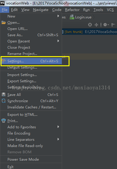 (1)打開Webstorm2017,菜單中選擇“File >> Settings…”,步驟如下;