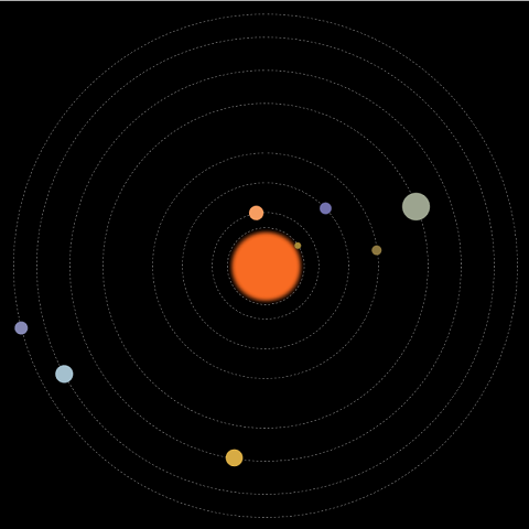 做一個太陽系八大行星的運轉動畫,不包括行星的衛星,所有行星圍繞太陽公轉,行星采用純色,暫時沒有自轉。