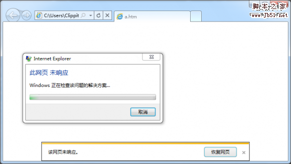 這個bug幾乎存在于現(xiàn)在流行的所有IE版本,從IE6到剛剛發(fā)布的Internet Explorer 9的第6個平臺預(yù)覽版。在IE6中,該頁面往往顯示為空白,但是整個窗口都無法交互。在IE8中,崩潰來得很徹底。而IE9 Beta增強(qiáng)了堅(jiān)固性,經(jīng)過我的實(shí)測,這個頁面又是會導(dǎo)致整個進(jìn)程無響應(yīng),而有時IE9會提示你網(wǎng)頁存在的問題,但是這都無法避免崩潰的現(xiàn)實(shí)。