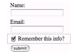 <form action="/path/to/script" id="thisform" method="post"> <p><label for="name">Name:</label><br /> <input type="text" id="name" name="name" /></p> <p><label for="email">Email:</label><br /> <input type="text" id="email" name="email" /></p> <p><input type="checkbox" id="remember" name="remember" /> <label for="remember">Remember this info?</label></p> <p><input type="submit" value="submit" /></p></form>