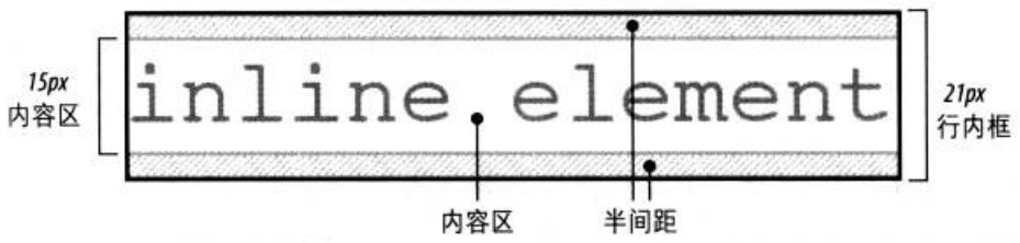 內(nèi)容區(qū)加上行間距等于行內(nèi)框。如果一個(gè)行內(nèi)非替換元素的font-size為15px,line-height為21px,則相差6px。用戶代理將這6像素一分為二,將其一半分別應(yīng)用到內(nèi)容區(qū)的頂部和底部,這就得到了行內(nèi)框