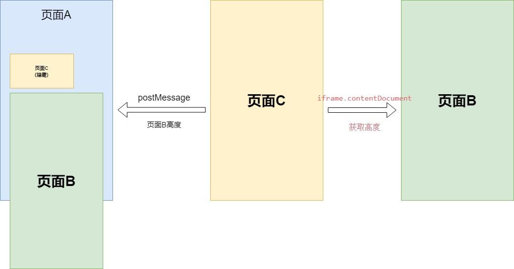 A頁面做的事情就比較簡單了,就是一個iframe加載B頁面,另一個iframe加載C頁面。通過message事件獲取最終高度,調整B頁面iframe的高度。