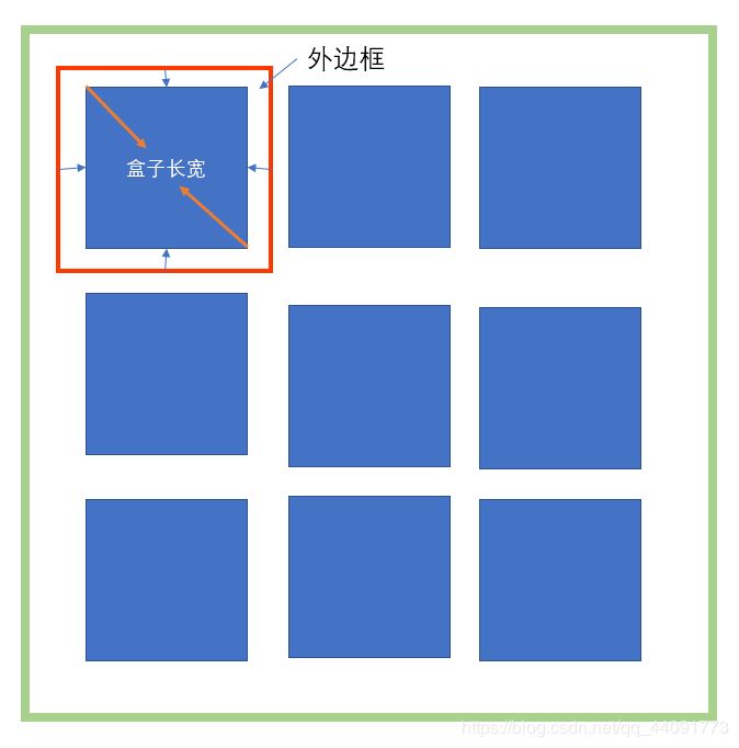 上圖是一個九宮格示意圖,現在我們把它想象到一個網頁中(想象不到就看上圖圖片~~),在網頁中這個布局由最外層綠色的大的div標簽包裹,在綠色的div標簽中有許多藍色的小的div標簽作為綠色div標簽的子級元素組成,這樣簡單的嵌套就完成了。由于我們的目標元素是藍色的小div,那么我們無可避免的要對其設置盒子大小,以及外邊距等等。但是我們操作的對象就是盒子的大小+外邊距(也就是上圖中紅色框選的區域)。