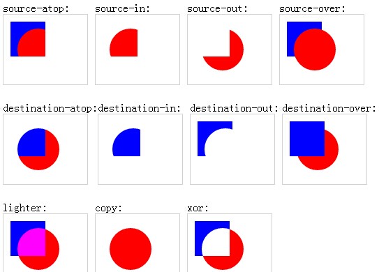 到了這一步就都寫完了,然后就是測試的時候了,結果并不樂觀,在android上還是卡啊卡啊,所以又得另想辦法,最終發現了繪圖環境中的globalCompositeOperation這個屬性,這個屬性的默認值是source-over,也就是,當你在已有像素上進行繪圖時會疊加,但是還有一個屬性是destination-out,官方解釋就是:在源圖像外顯示目標圖像。只有源圖像外的目標圖像部分才會被顯示,源圖像是透明的。好像不太好理解,但是其實自己測試一下就會發現很簡單,也就是在已有像素的基礎上進行繪圖時,你繪制的區域里的已有像素都會被置為透明,直接看張圖更容易理解:
