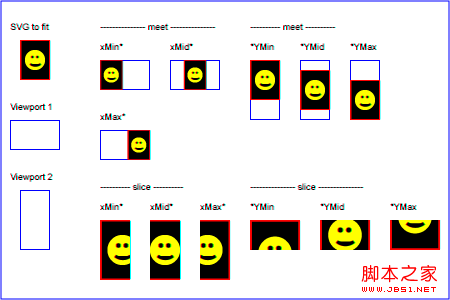 xMidYMin - 強制統(tǒng)一縮放,并且把vivewBox中X方向上的中點對齊到viewport的X方向中點處,簡言之就是X方向中點對齊,Y方向與上面相同。