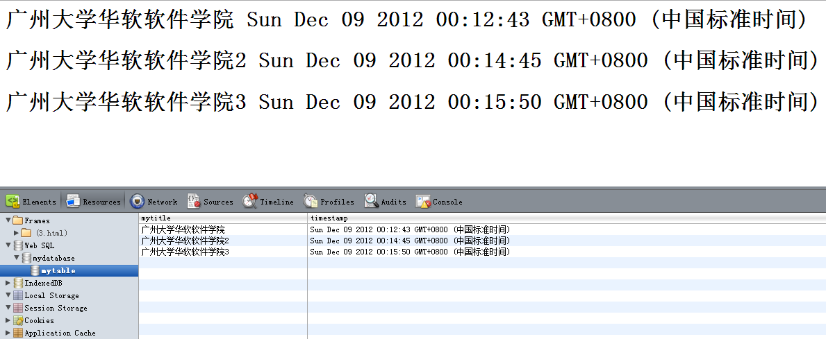 tx.executeSql("INSERT INTO mytable (mytitle, timestamp) values(?, ?)", ["廣州大學(xué)華軟軟件學(xué)院3", d.toLocaleString()], null, null);