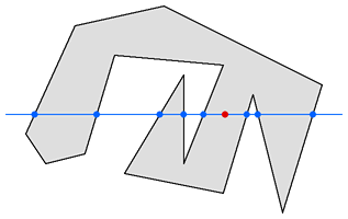 射線法是一個我講不清道理但非常好用的方法,只要判斷點與多邊形一側的交點個數為奇數,則點在多邊形內部。需要注意的是,只要數任何一側的焦點個數就可以,比如左側。這個方法不限制多邊形的類型,凸多邊形、凹多邊形甚至環形都可以。