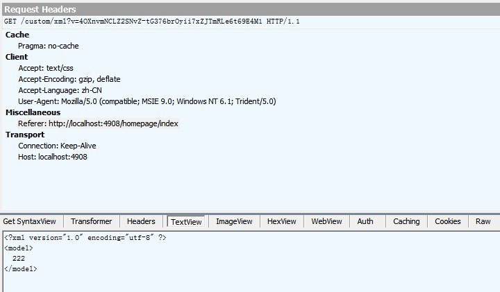 這個URL的生成有專門的BundleResolver對象來完成,我們只需要傳入所有的BundleCollection對象,我這里為了能在瀏覽器中測試所以寫了一段stylesheet類型的link;這樣我們就能直接在我們需要的地方直接使用了,我在index視圖中引用:@MvcApplication4.Seed.XmlBundleRender.Render("~/custom/xml");是不是很簡單,這樣我們就能對所有想控制捆綁的文件進行捆綁,只需要繼承加簡單的靜態方法輔助;