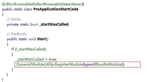 Bundle的連接地址,雖然它在HTTP的管道中;找到它就好順藤摸瓜了,但是奇怪的是我在Web.config里沒有發現它的配置信息,奇怪了,難道它還跑去系統文件改,當然是不可能的;所以我一時還想不起能有什么辦法動態注冊,提起動態注冊突然有了思路,好像有一個Assembly級別的特性用來注冊Application_Start啟動時候的前置代碼,會在Application啟動之前執行,來看一下;