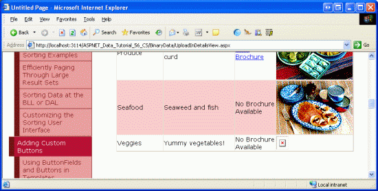 確認(rèn)頁面要求上傳一張圖片,且不接受非PDF或非JPG文件。添加一個包含JPG格式圖片的新類別,將Brochure列置空,點擊Insert按鈕后,頁面回傳,將為Categories表添加一個新記錄,同時上傳的圖片數(shù)據(jù)直接存儲進數(shù)據(jù)庫。GridView控件更新后,將新添加的類顯示出來。但是,就像圖10所示的那樣,類的圖片沒有正確的顯示出來。