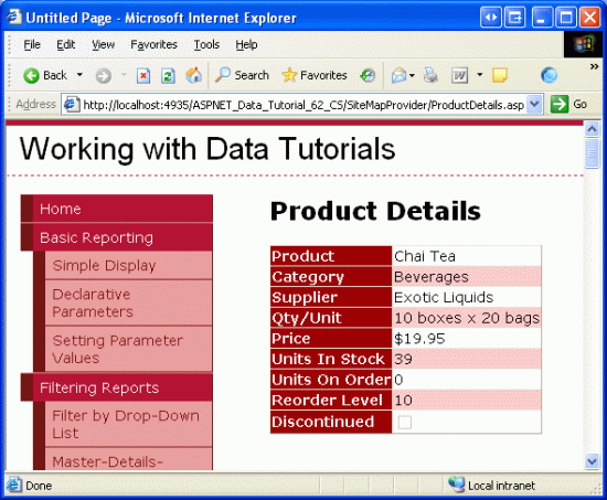 除了SiteMapPath外,還可以使用其它的導(dǎo)航控件,比如Menu 和 TreeView控件.本章的下載代碼里,Default.aspx, ProductsByCategory.aspx,和ProductDetails.aspx頁(yè)面都包含Menu控件(見(jiàn)圖20).要想更深入的了解ASP.NET 2.0里的導(dǎo)航控件和site map體系的話,可參閱《ASP.NET 2.0 QuickStarts》系列(http://quickstarts.asp.net/QuickStartv20/aspnet/)的《Examining ASP.NET 2.0's Site Navigation Features》和《Using Site Navigation Controls》部分.