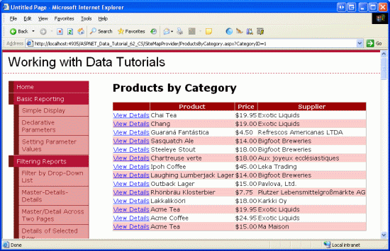 返回來(lái)登錄Default.aspx頁(yè)面,點(diǎn)Beverages(飲料)的“View Products”鏈接,這將轉(zhuǎn)到ProductsByCategory.aspx?CategoryID=1頁(yè)面,顯示飲料類(lèi)的所有產(chǎn)品的names, prices, 和 suppliers信息(見(jiàn)圖11)。盡管改進(jìn)該頁(yè)面吧,添加一個(gè)鏈接以方便用戶返回上一頁(yè)(Default.aspx) .還可以添加一個(gè)DetailsView 或 FormView控件來(lái)顯示該種類(lèi)的名稱和描述。