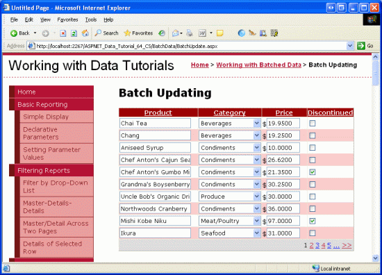 以上代碼首先調用BatchUpdate()方法;再使用ClientScript property屬性來注入JavaScript,以顯示一個messagebox,提示“The products have been updated.”