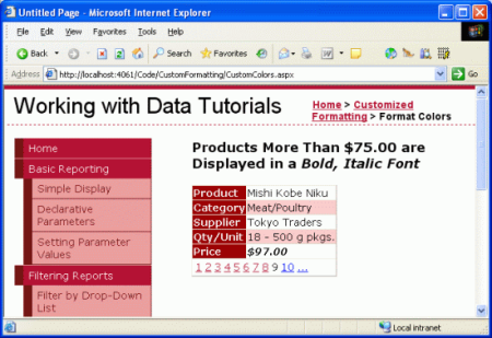 當(dāng)查看Chai(費(fèi)用低于$75.00),價(jià)格將會(huì)用正常格式顯示 圖4),但是當(dāng)查看Mishi Kobe Niku,(價(jià)格為$97.00)則會(huì)用我們設(shè)置的格式顯示(圖5)
