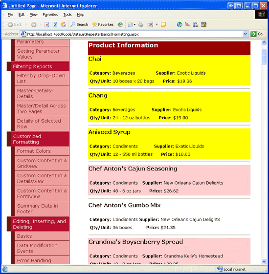 在學(xué)習(xí)格式化之前,我們首先創(chuàng)建一個(gè)使用DataList顯示product信息的頁(yè)面.在前面一章里,我們創(chuàng)建了一個(gè)ItemTemplate顯示product 的name,category, supplier, quantity和price的DataList.我們?cè)诒菊聛?lái)重復(fù)做一次.你可以重新創(chuàng)建DataList和它的ObjectDataSource ,或者直接把前面一章里的Basics.aspx里的控件復(fù)制到本章的頁(yè)面(Formatting.aspx)里.當(dāng)你完成了Formatting.aspx后,將DataList的ID從DataList1改為ItemDataBoundFormattingExample.下面,在瀏覽器里看看DataList.如圖1所示,唯一的格式在于每個(gè)product的交替的背景色.